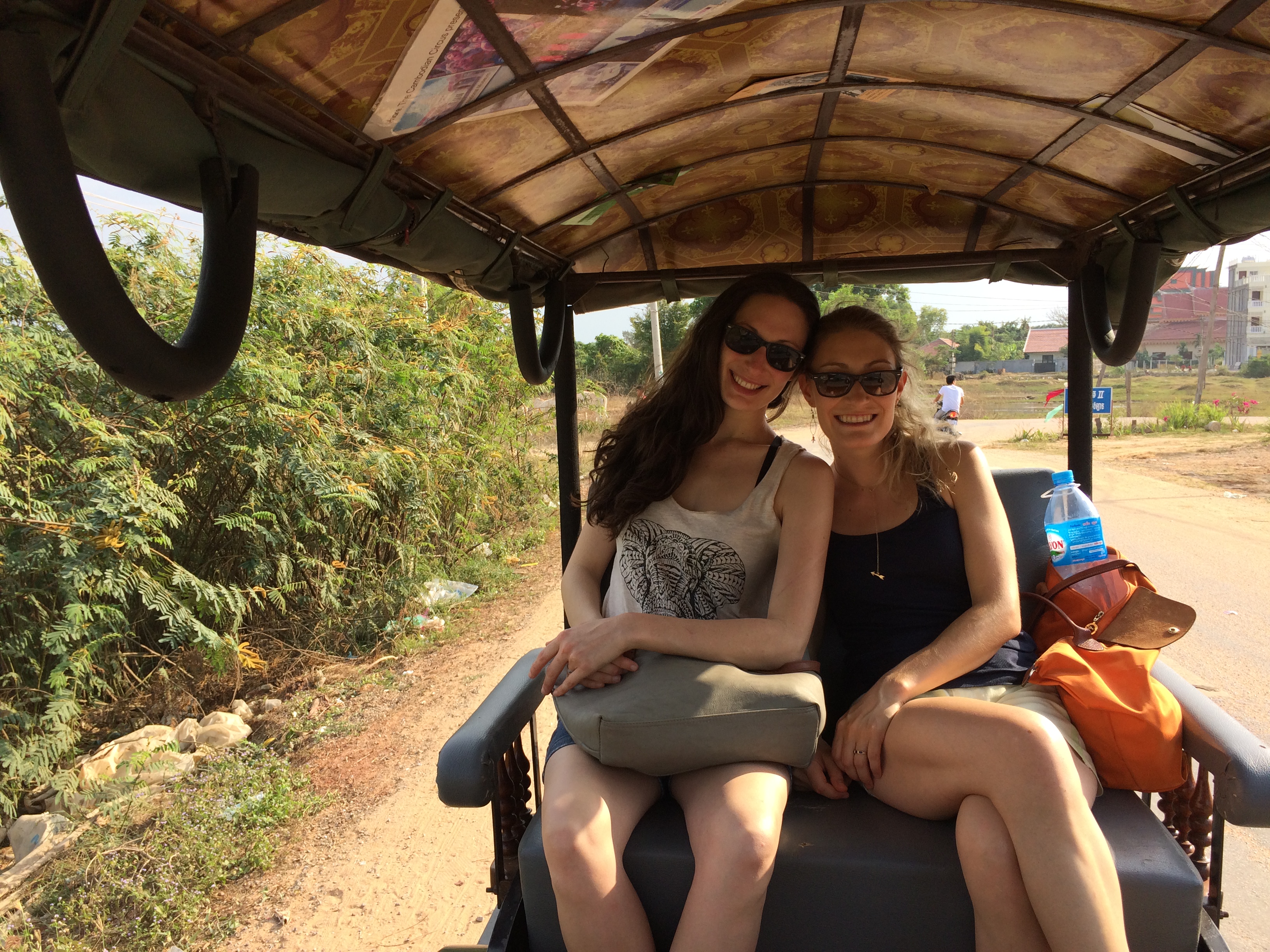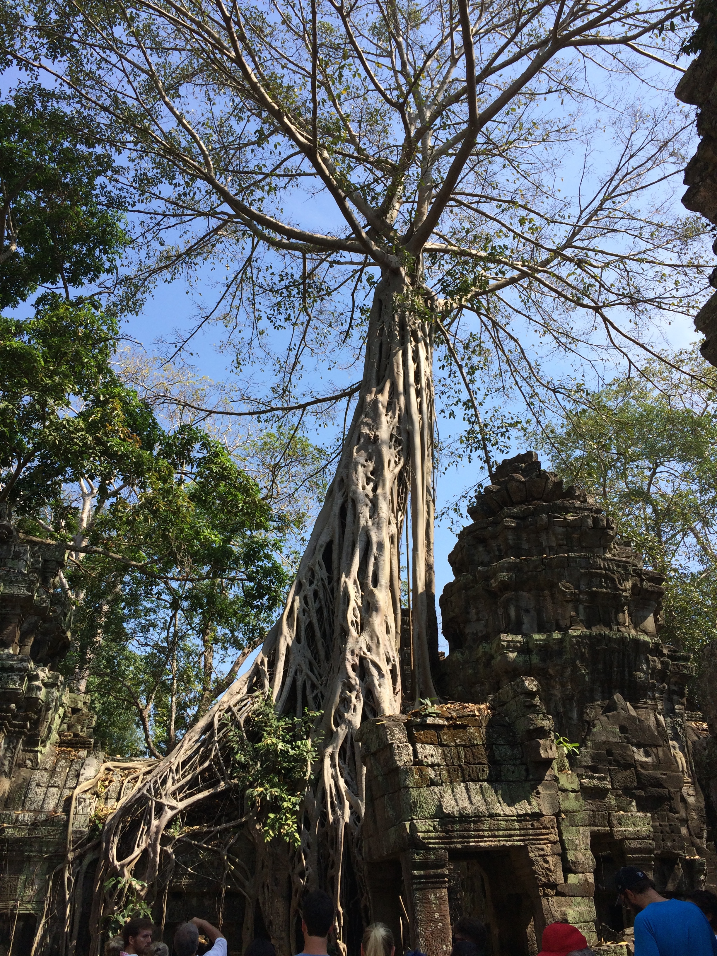 Our hotel breakfast consisted of muesli, fresh fruit, and instant coffee which smelled strangely of hot chocolate, but it did the job.  We had arranged for Mr. Pov to take us to the temples and then the floating village that day, and after being advised to change out of our shorts and tank tops so we would be admitted into the temples, we set off before 9am in dresses, with eager anticipation of all we were going to see.  Our tuktuk awaited us and Mr. Pov had come prepared with a cooler full of water.  We set off for Angkor Wat, and as we drove over dirt roads, soaking in the clean air and lush, beautiful landscape, we instantly fell in love with the tuktuk and Mr. Pov.  Our slogans became #everythingsbetterinatuktuk and #onetuktukforlife.  IMG_2976Angkor Wat was so vast, with so many corridors and alleyways, and intricate stone carvings of goddesses and flowers and vines.  There was a large buddah-like object, and as a man reverently prayed before it, so did his young daughter for a few minutes until her attention span for such devotion ran out.  People were adorning this statue with food, fruit, and intricately woven flowers.  The main temple within Angkor Wat had a line to get into it, and we chose not to wait as we had a packed schedule.  We saw some beautiful Cambodian women in native costumes of butterflies and peacocks.  The colors so vibrant with gold accents.  We also tried fresh palm juice, which tasted and smelled like sweet buttered popcorn.  Not a good combination.  Exiting Angkor Watt we passed through the market area, where we were instantly drawn to the ornate fabrics and elephant patterned princess Jasmine pants #notleavingwithoutelephantpants became another mantra.  Searching for Mr. Pov outside the entrance, we saw small shells covered in chili and salt, spread on a metal pan atop a wooden cart and wondered what it was.  On our night market tour we found out that the small shells are cooked by the heat of the sun drawn to the metal tray, and these are a popular snack, as we soon saw such peddlers all over the city.  Mr. Pov whisked us away to our next stop, the Bayon Temple, and as we drove through the jungles, we spotted a large pig, then a few monkeys, then a man riding an elephant!  All in the span of about two minutes!  Where were we?!  And what was next?!  When the Bayon Temple was constructed it had 49 towers, each displaying 4 faces of the gods and king.  Needless to say this temple was quite…in your face!  I loved climbing through the rubble as much as the in-tact parts.  There were so many stairs, passage ways, nooks and crannies.  I loved all of the faces.  Both in Angor Wat and here at Bayon, the rock had a charred black look in many places, like there had been a fire.  Visitors had stacked rocks from the rubble and I felt like I was back in Shutesbury or Wendell.  Our last temple stop was to Ta Prohm, and to get there we walked down a long jungle path, where at points we were serenaded by groups of men playing traditional Khmer instruments.  I was not prepared to be so amazed by this temple, and the beauty of God’s creation!  Whereas the elements have left their dark handprint on the other temples we visited, the beauty of Ta Prohm has been enhanced by being left to the devices of the jungle that surrounds it.  Monstrous trees grow right out of the temple, their exposed vines weaving and choking the stone structure.  IMG_2736As the sun gently streamed through the canopy of leaves, I expected to see fairies and wood nymphs appear.  It’s a magical, tranquil place, while at the same time it had a “Temple of Doom” feel, as I could picture Indian Jones marching around, cutting away vines with a machete in search of hidden treasure.  I learned from later research that in its peak the temple was home to more than 12,500 residents, 18 high priests, and was maintained by 80,000 Khmers who lived in the surrounding area.  Famished by all of this temple trekking, Mr. Pov took us to a local spot where we tasted traditional Khmer (Cambodian) cuisine.  Our banana flower salad with chicken was incredible – the banana flower was tender yet crunchy, balanced by local herbs, and dressed with the flavors of nuon chom.  This ended up being one of the most memorable dishes of our entire trip!  Our fresh spring rolls had pork, herbs, a type of local green, vegetables, and more nuon chom.  The Fish Amok Curry, the national dish of Cambodia, was delicate yet immensely flavorful.  The fish melted in your mouth, and a chiffonade of a local greens added welcomed texture.  The only downside to the meal was our iced coffee that tasted like a coffee milkshake!  We were quickly learning that we would not get a good cup of coffee until we reached Hanoi!
