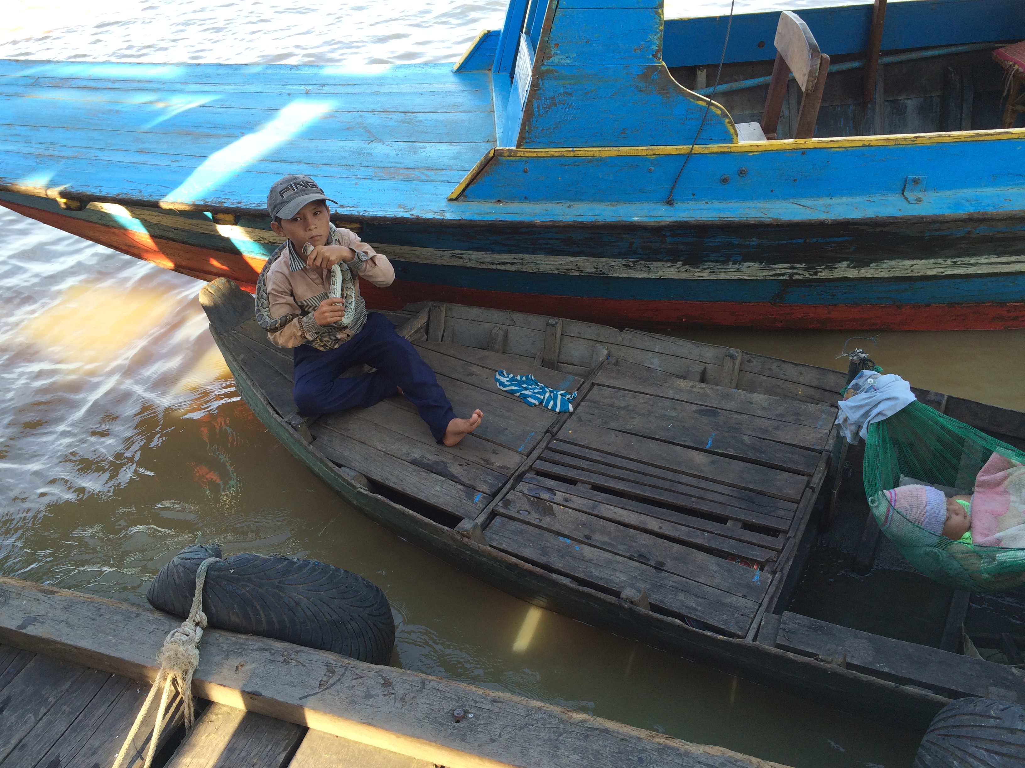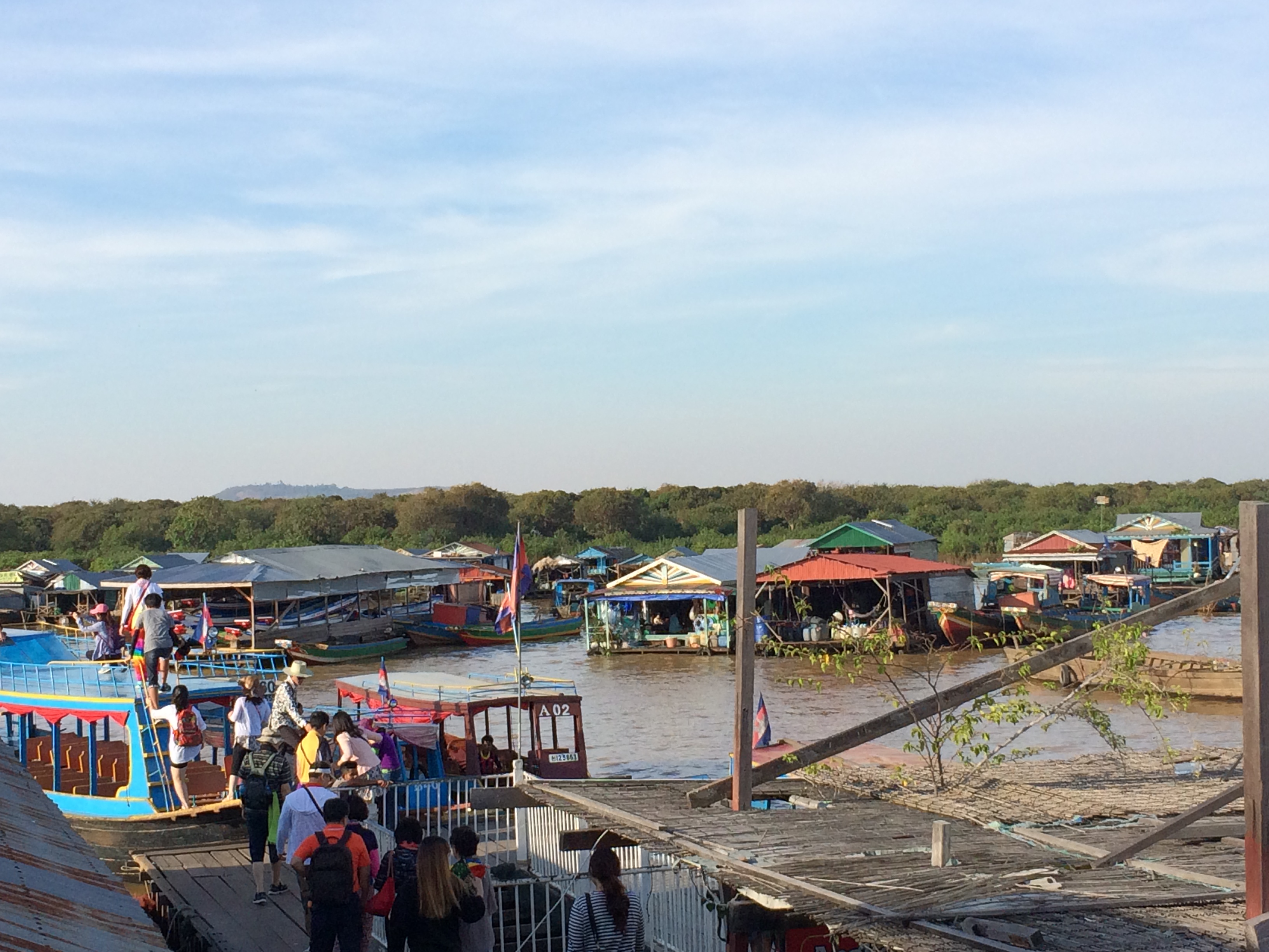 Mr. Pov was a doll, periodically giving us more water, asking us if we were doing ok, and how we were liking everything.  His English, especially comprehension, was minimal, and our conversations were really comical at times, but we made it work!  He told us that he takes an English class for one hour each afternoon.  We taught him the word, “cool” and I’ll never forget how he sounded saying it.  Our plans for the afternoon were to visit a floating village and Mr. Pov informed us that the more beautiful village was several hours away, so we opted to go to the closer, less beautiful village.  Our ride to the boat was so picturesque as we would through neighborhoods, markets, and jungle.  The roads were a mix of concrete and reddish soil, and while people certainly live simply, and often poorly – sometimes in makeshift houses, there was nowhere near the poverty or filth that I’ve become so accustomed to in the Philippines.  The streets are relatively clean, and I didn’t see anyone begging except a few in the downtown area.  Siem Reap is also so much less commercialized, and it was such a welcomed change to drive through neighborhoods and not be bombarded by advertisements.  We arrived at the port and the brown canal was lined with boats ready to take us to the village.  As we gave our ticket stub to the collector, I noticed a girl snap a picture of me.  I wondered why she did this, and thought maybe she also thought I looked like Elsa.  On our boat was Mr. Pov, our captain, and his assistant.  Elissa and I sat on the bow, soaking in the sun and the view.  Along the canal was a tall sand embankment and there IMG_2767were loaders, dump trucks, and Volvo bulldozers doing site work.  I didn’t know what to expect of this floating village, and when we finally hit the open ocean, we were told we had arrived (and according to our Captain, were looking at Vietnam!)  The village is all boats; many of them houses – all with fishing nets.  There were also some restaurants, mostly catering to tourists and boasting many different cuisines, and there was a Catholic church and a Christian church, and a school.  We were let off at a souvenir boat where there were also a few crocodiles held in captive display in a hole cut in the center of the boat.  In a small canoe next to this boat sat a mother with a baby sleeping peacefully in a tiny hammock strung between the two sides of the canoe.  On the opposite end sat a young boy with a boa constrictor wrapped playfully around him!  After shrieking, I took a picture of this scene and then quickly walked away.  The little boy started asking for money, and then got out of the boat!  He wanted me to pay him to pose with his snake, and started chasing me around!  I was screaming at him to go away, and our boat captain had to intervene and tell him to leave me alone!  IMG_2762Our captain brought us safely back to shore, and as we were leaving the port, a woman appeared holding two small plates, one with my photo on it and one with Elissa’s!  That’s why she snapped that shot!  What a sneak, and entrepreneur, as we couldn’t say no to purchasing this memory for $5!  By now, hopping onto our tuktuk was second nature, and as the sun set we headed back to the hotel to freshen up before a night out on Pub Street.  Back at our room, I realized I was and had been completely relaxed all day.  Even though we were in an entirely foreign place that I knew so little about, and had spent our day at the mercy of our fearless tuktuk wielding guide, I could not have felt more at ease!  What a magical place!