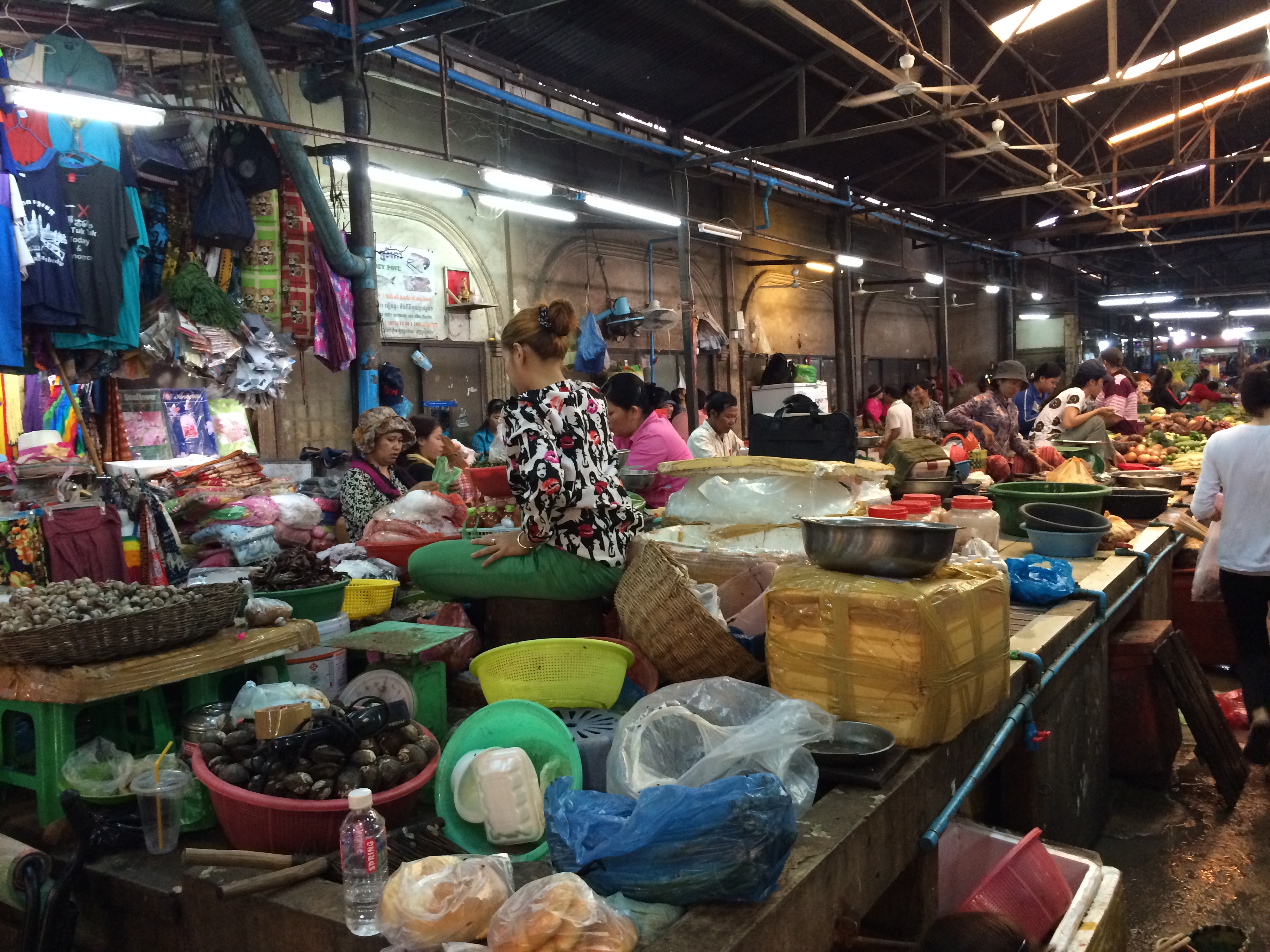 We had learned from Matt that there was a whole other part of the Old Market that we had somehow missed – the part with the food!  We discovered it Wednesday morning, and I’ve never seen anything like it in my life.  Rather than stalls divided into categories, there were mounds of items everywhere.  Women were sitting on the ground filleting fish, with a pile of bok choy next to them.  IMG_2936Tables held piles of vegetables, fresh fish, dried fish, curry and fish pastes, seafood, fruit, fresh noodles, and more women, sitting indian-style amidst it all.  It was hard to get a picture of ingredients without also capturing a random foot in the shot!  The meat area was impressive, and huge cuts of meat down to small strips were expertly broken down.  IMG_2964That afternoon, we had asked Mr. Pov to take us around to see more of Siem Reap before bringing us to the airport.  On our comfortable tuktuk, with our favorite driver, we drove through the farmlands and neighborhoods, down dirt roads where at one point we had to stop to let a heard of cows go by.  Some of them were marked down their back with a red line, and Mr. Pov told us they were heading to be slaughtered.  Cambodia is a beautiful, tranquil place.  The people are endearing and welcoming.  When they speak English, they add an “s” to the end of many words, like “thank yous.”  I loved every minute of our time there, and was really sad when Mr. Pov dropped us off at the airport.  While there are so many other places in Asia I want to visit, I hope and pray to return to Cambodia some day!