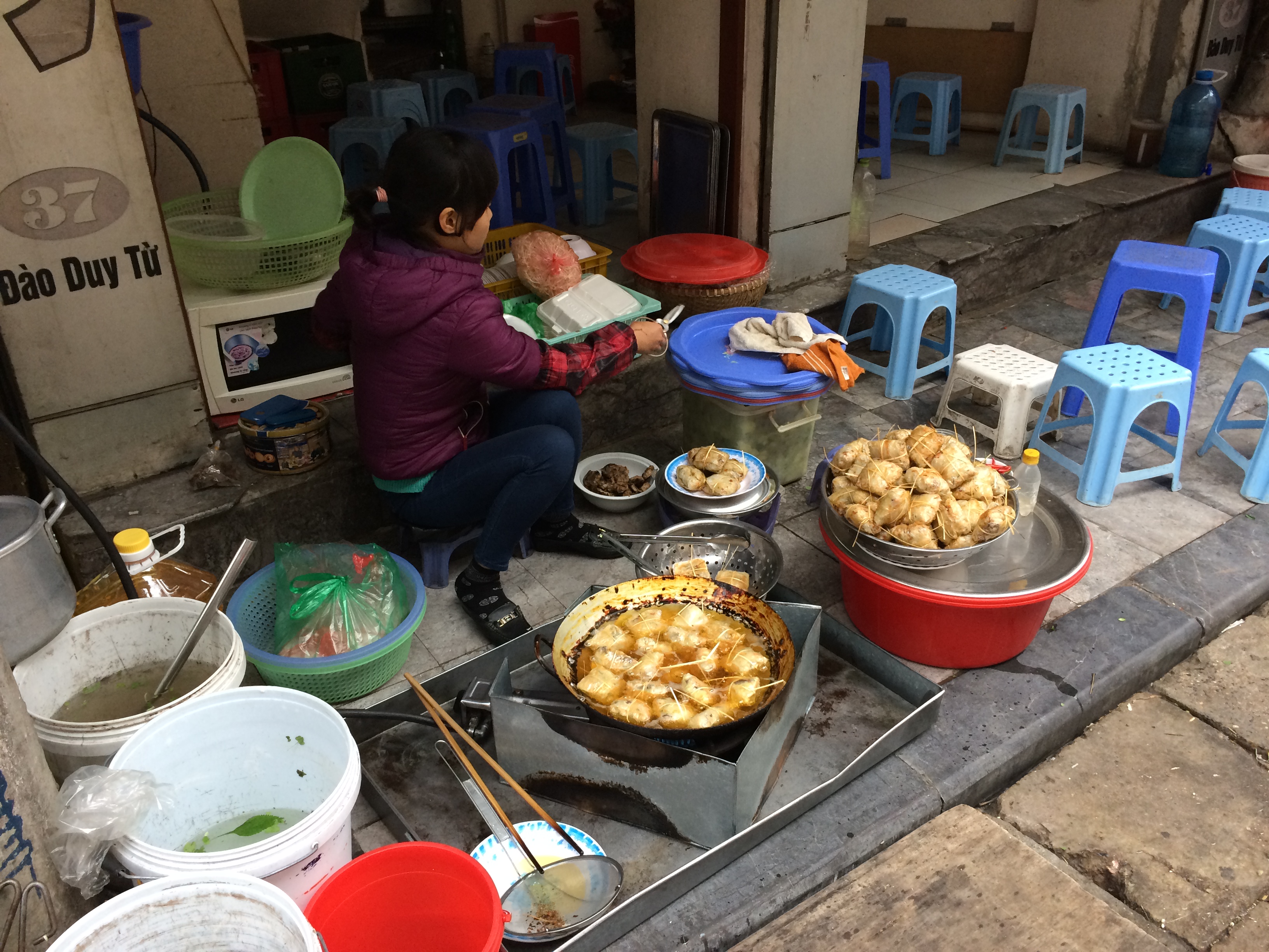 nd a good looking coffee shop, relieve ourselves of all the liquids we were consuming (coffee & pho), and fuel up and warm up our freezing bodies with more coffee and the chance to be indoors. We came upon a cafe with many people sitting out on the sidewalk, drinking coffee or a ubiquitous, mild, room-temperature tea. There was a woman crouched down on the side of the road (not even the sidewalk!) beside a small frying pan set over a charcoal fire kept in a metal basin, with a metal shield on one side to trap the heat. She was cooking up omelets that smelled amazing, transforming them into yet another banh mi of sorts, and selling them to the people drinking at the cafe. Quite ingenious! The rest of her set-up included a bag full of eggs, a small cup and chopsticks to whisk the eggs, a bag of chopped fresh herbs, a small bottle of salt, a squirt bottle of oil, a basket holding a plastic bag of baguettes, scissors to cut open the baguettes, pickled papaya and carrot, hot sauce, and newspaper sheets to wrap the sandwiches in. After whisking the eggs, adding a generous handful of herbs and seasoning, she fried the omelet, folded it in half and tucked it into the baguette, topped it with pickled vegetables and hot sauce, and then crisped up the outside in the sauté pan. It was the most amazing egg sandwich I’ve ever eaten, and on our last day in Hanoi, Elissa and I relentlessly searched the streets, in the rain and cold, until we found this woman again, since she doesn’t “rent” any one sidewalk space. Hungry yet? Good! So now onto our food tour! Our guide was adorable and had just finished college.