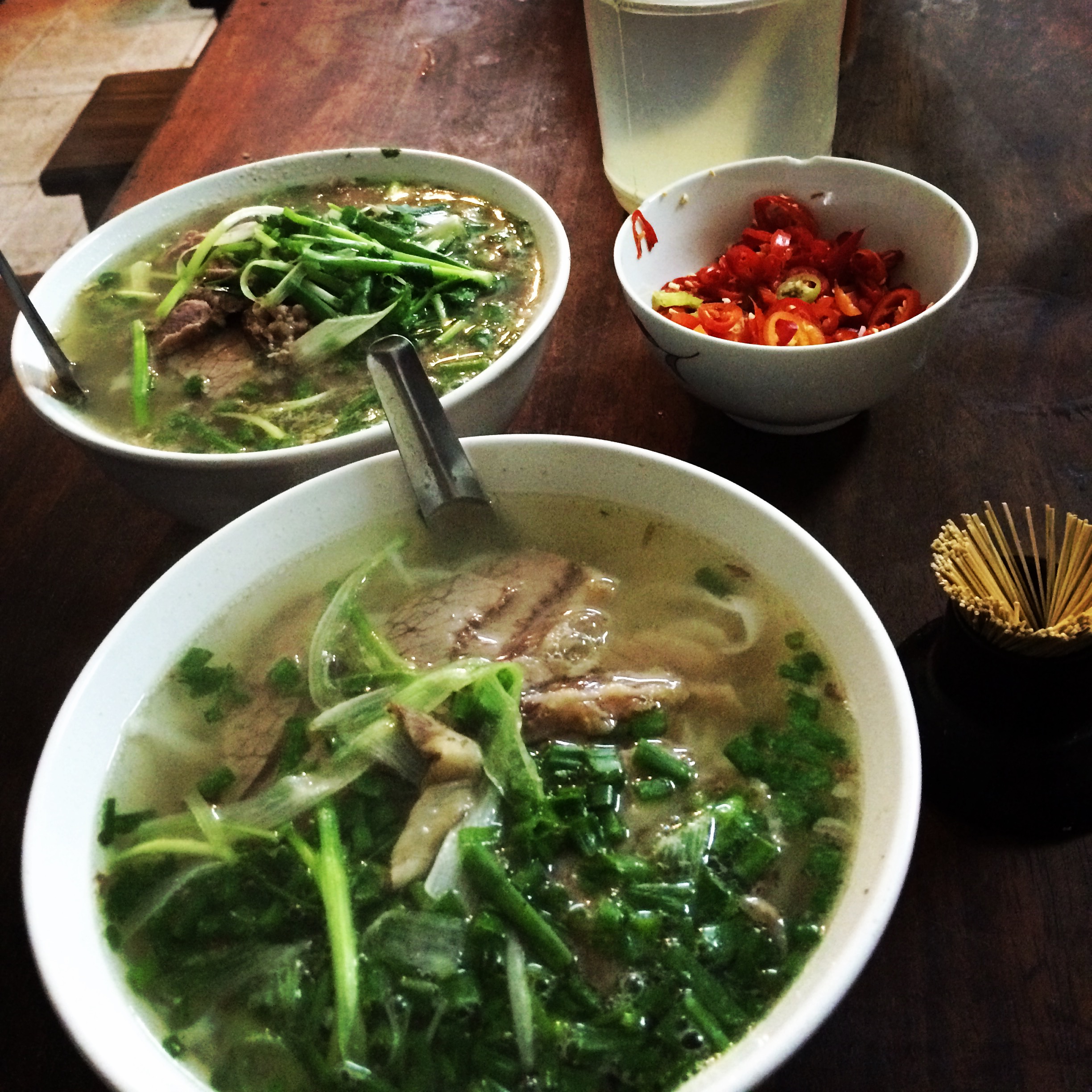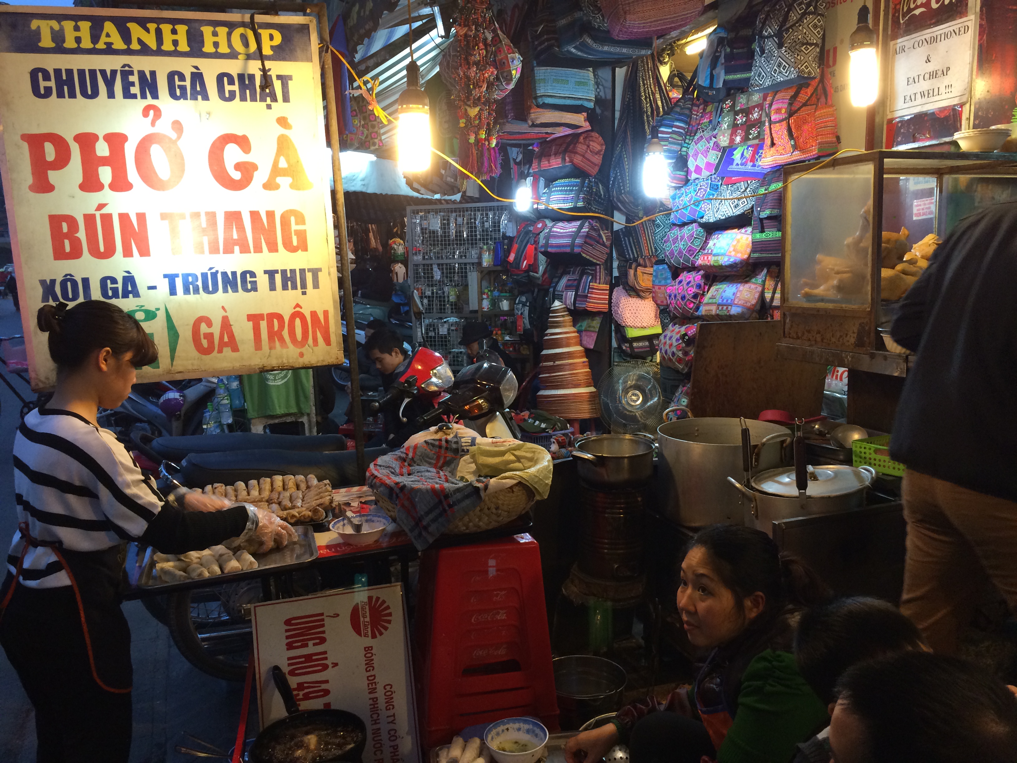 ay from Hanoi by bus, then boat tour of the bay. We again had a wonderful guide, and the views were incredible. Huge rock formations rise up out of emerald water. The most famous rocks look like 2 birds fighting (or kissing, depending how you look at it.) There are also floating villages here, like in Siem Reap. Thankfully the rain held off, and we enjoyed some lounging on the deck (just not in bikinis!) We hiked inside a vast cave at the edge of one of the formations, filled with stalagmites and stalactites. The cave was probably 100 feet tall at some points, and you could spend hours coming up with objects that the formations resembled. We returned to Hanoi that night with pho still on our minds, as we hadn’t eaten nearly enough of it yet. My research, confirmed by the guide from our food tour, led us to Pho Bat Dan, famous for their beef pho. No one there spoke English (always a good sign) and the woman in charge was big an burly, expertly hacking and shaving off pieces from huge slabs of different cuts of aged beef. We didn’t know what to order, so we just chose two of the three pho options. One contained thinly sliced brisket that melted in your mouth, and the other had brisket and a chewier, thicker cut as well. Both had generous amounts of scallions and fresh noodles, and the most intensely amazing beef broth I’ve ever eaten. Seasoned with a bit of chili and fish sauce, I could have taken a bath in this soup!! We wandered through the night market that sets up on the weekends along one of the main streets, but since it had started to rain most of the food vendors hadn’t ventured out, and we weren’t interested in anything else!