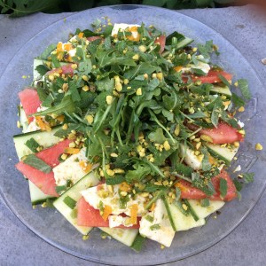 Spread 1/3 of the pesto on the bottom of a large platter. Arrange watermelon, feta & cucumber pieces, somewhat overlapping, in rows or in a concentric circle. Drizzle with additional pesto. In a bowl, toss arugula with juice from the orange, some of the oil from the marinated feta, salt & pepper to taste. Mound arugula in the center of the platter, and sprinkle with mint & reserved pistachios.
